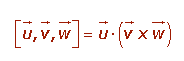 El producto mixto de los vectores vector u, y w es igual al producto escalar del primer vector por el producto vectorial de los otros dos.